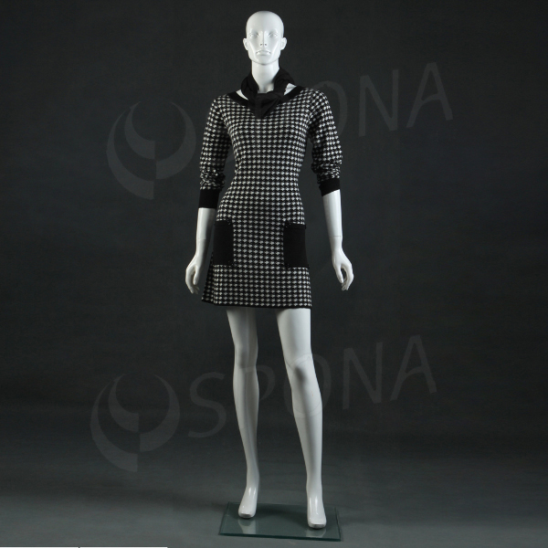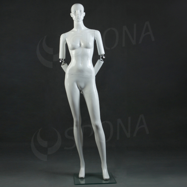 Abstraktní bílá lesklá stojící figurína se skleněným podstavcem je hitem současné módy. Pohyblivé ruce díky kloubům v loktech.