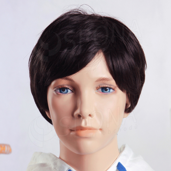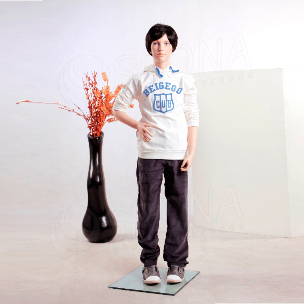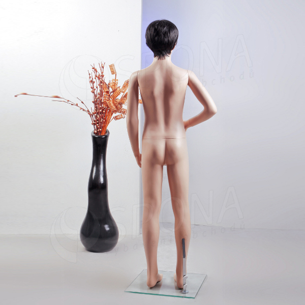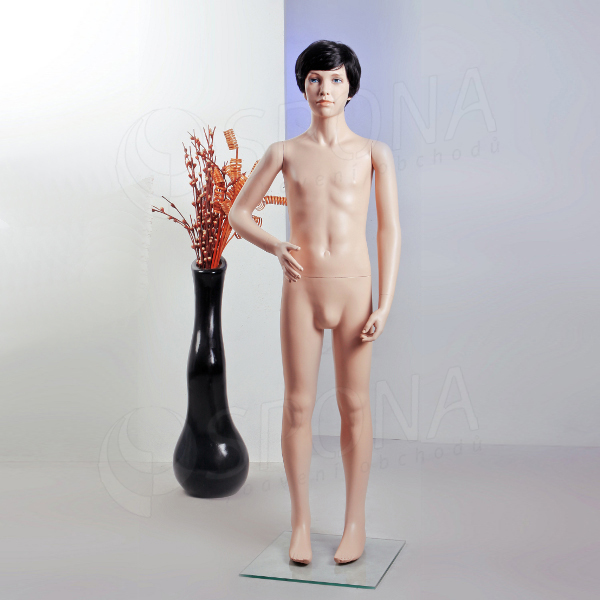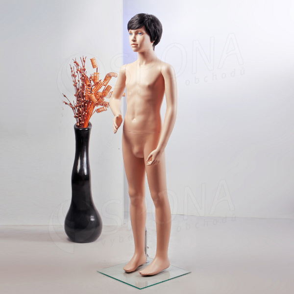 Dětská figurína stojícího chlapce v tělové barvě, bez paruky včetně skleněného podstavce.