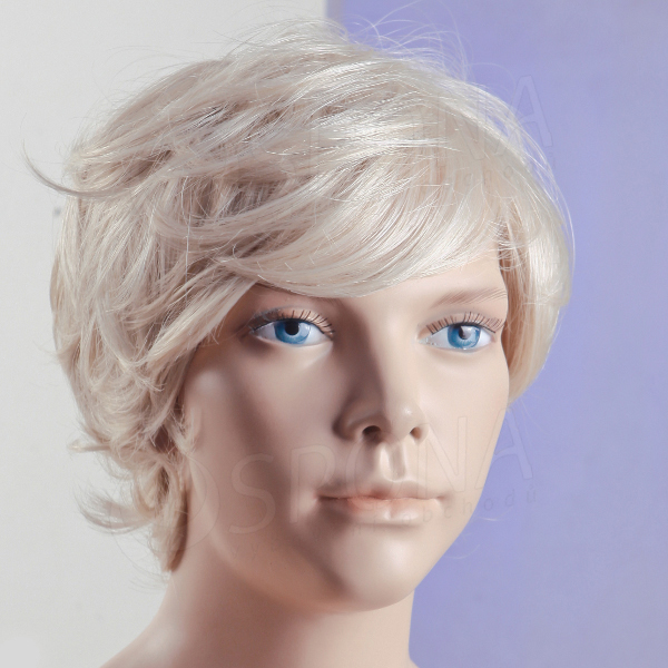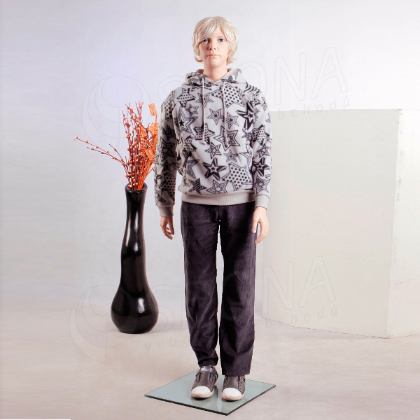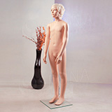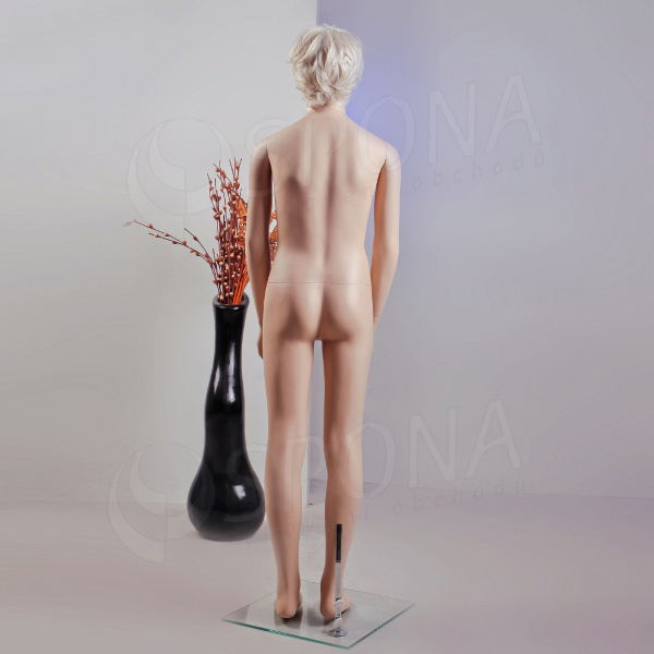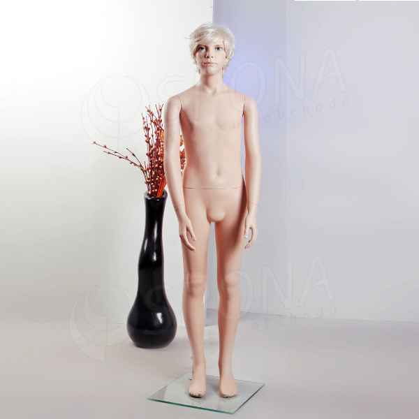 Dětská figurína stojícího chlapce v tělové barvě, bez paruky včetně skleněného podstavce.