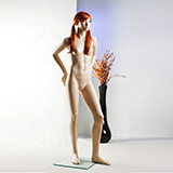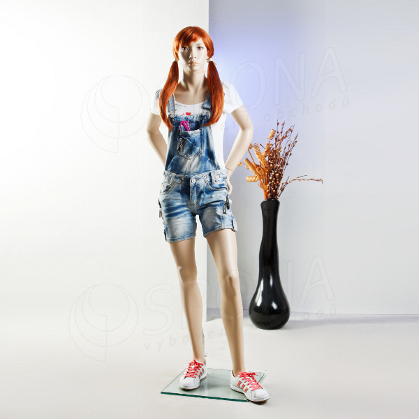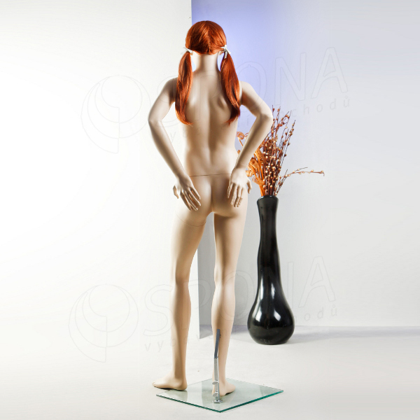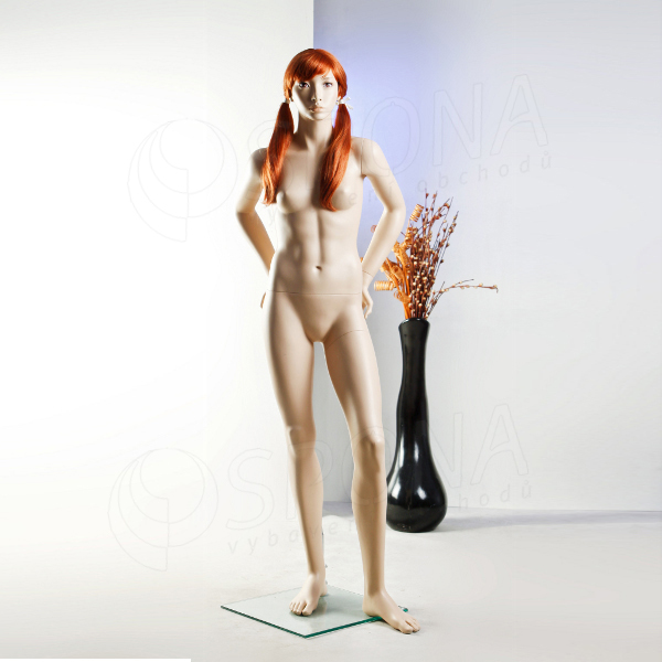 Figurína mladé slečny s jedinečným postojem v tělové barvě, se skleněným podstavcem, bez paruky.
