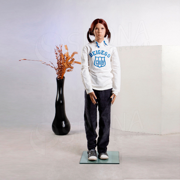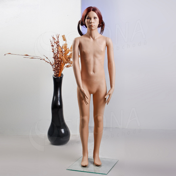 Kvalitní figurína malé dívky v tělové barvě bez paruky, včetně skleněného podstavce.