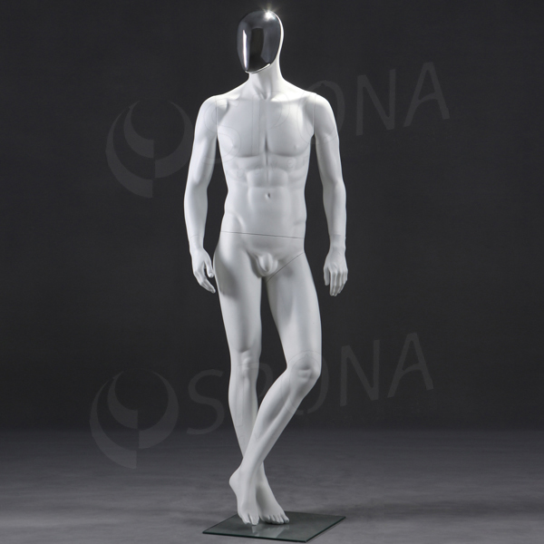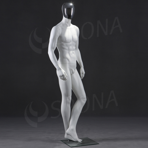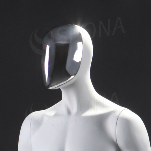 Velmi moderní kombinace matné bílé barvy a lesklého chromu vytváří z této pánské figuríny jedinečný designový prvek.
