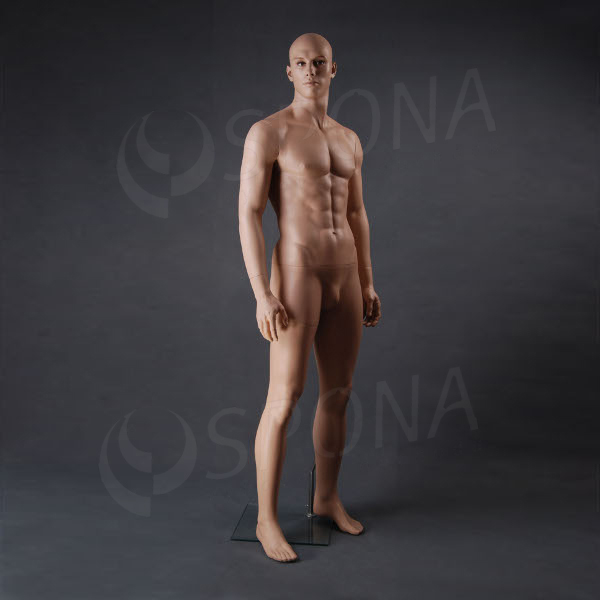 Stojící figurína urostlého muže v tělové barvě bez paruky včetně skleněného podstavce.