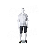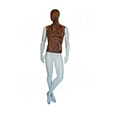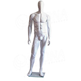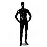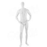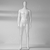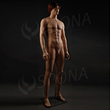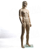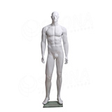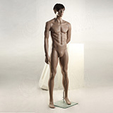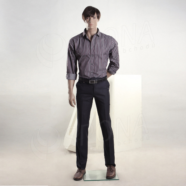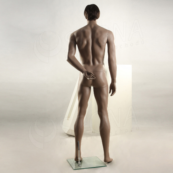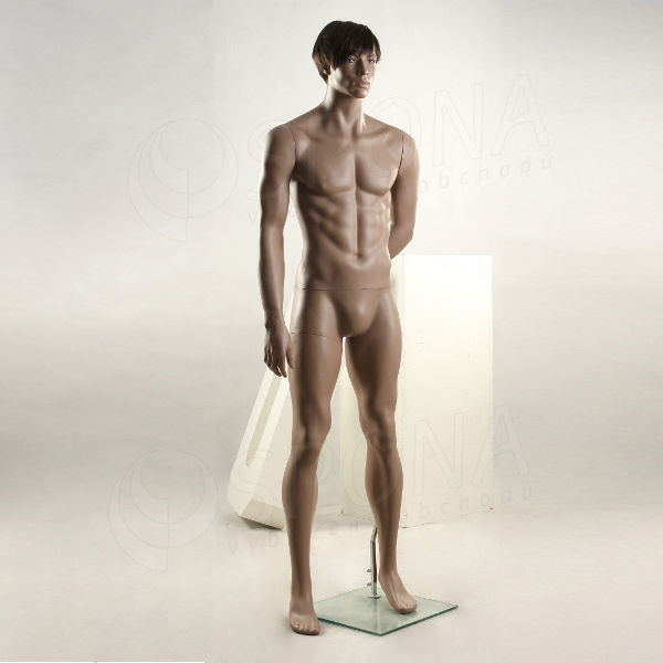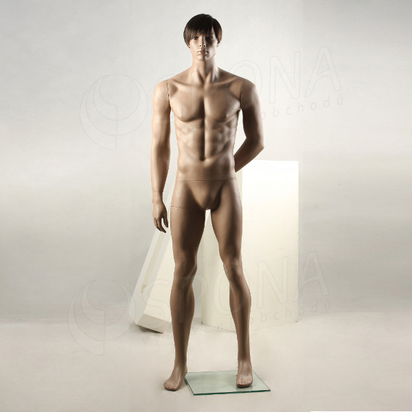Stojící pánská kvalitní figurína v tělové barvě, bez paruky se skleněným podstavcem.